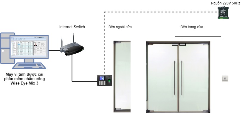 Trên máy tính của nhân viên được phân công theo dõi chấm công sẽ được cài phần mềm chấm công Wise Eye Mix 3, chi tiết hướng dẫn sử dụng của phần mềm này được thể hiện ở một trang khác. Trên phần mềm chúng ta khai báo máy chấm công với IP của máy chấm công trên. Dữ liệu nhân viên đã đăng ký trên máy chấm công được tải về là lưu lại trên dữ liệu phần mềm, ta tiến hành đặt tên nhân viên và phân ra các phòng ban cho dễ theo dõi việc chấm công. Phần mềm được thiết lập ca làm việc theo từng lịch trình được đinh sẵn các thông số của nó. Các nhân viên được xếp vào một lịch trình. Hàng ngày hay hàng tuần chúng ta dùng phần mềm này để tải các sự kiện chấm công về phần mềm và xem công, xuất báo biểu. Tất cả các báo biểu được mở bằng MS Excel.