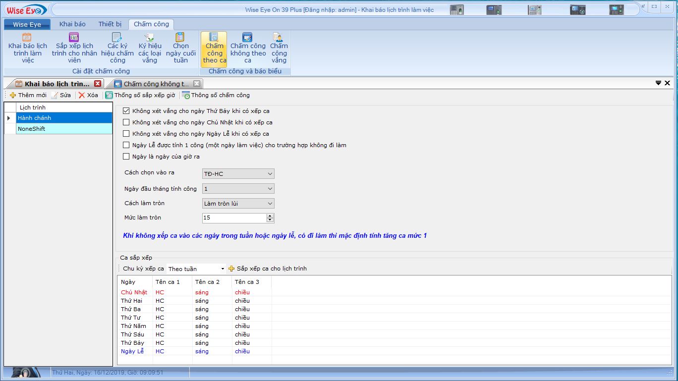 Chấm công luân phiên giữa ca hành chánh (07:30-17:00) và 3 ca làm việc (tức là các ca 06:00-14:00, 14:00-22:00, 22:00-06:00) là vấn đề khó xử lý trong phần mềm Wise Eye On 39. Vì thông thường ca hành chánh thì chúng ta tạo lịch trình với cách sắp xếp giờ tự động trong ngày, 3 ca làm việc thì chúng ta tạo lịch trình với cách sắp xếp giờ tự động qua đêm. Nếu chúng ta dồn 3 ca và ca hành chánh một lịch trình thì ta cần chọn cách sắp xếp giờ tự động qua đêm và khi chấm công theo ca dễ nhầm lẫn giữa ca 1 và ca hành chánh. Một giải pháp để loại trừ phần mềm chạy sai ca thì ta tạo 2 lịch trình hành chánh và lịch trình theo ca rồi sắp xếp một lịch trình nào đó vào lịch trình phụ nhưng Wise Eye On39 đã không luân phiên được cách xếp giờ của lịch trình tạm. Chúng tôi đã cải thiện khuyết điểm này trong Wise Eye On 39 Plus.